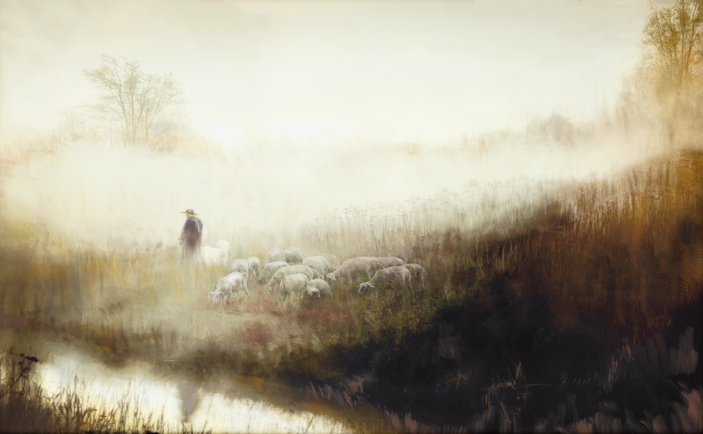 animal, animals, atmosphere, branch, classic, cloud, ecoregion, fog, foggy, herd, herding, herdsman, landscape painting, mist, misty, moody, natural landscape, part of a set, people in nature, plant, set, sky, tree, wood