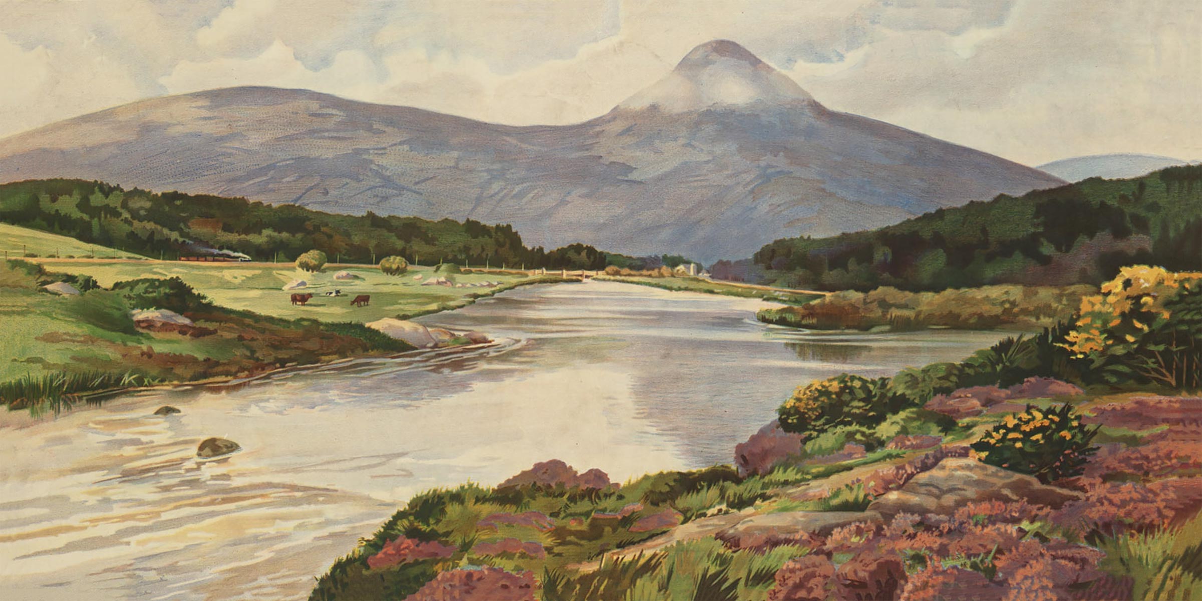 cloud, ecoregion, hill, illustration, ireland, lake, landscape, mid-century, mountain, natural landscape, nature, plant, pond, river, sky, tourism, travel, water, water resources