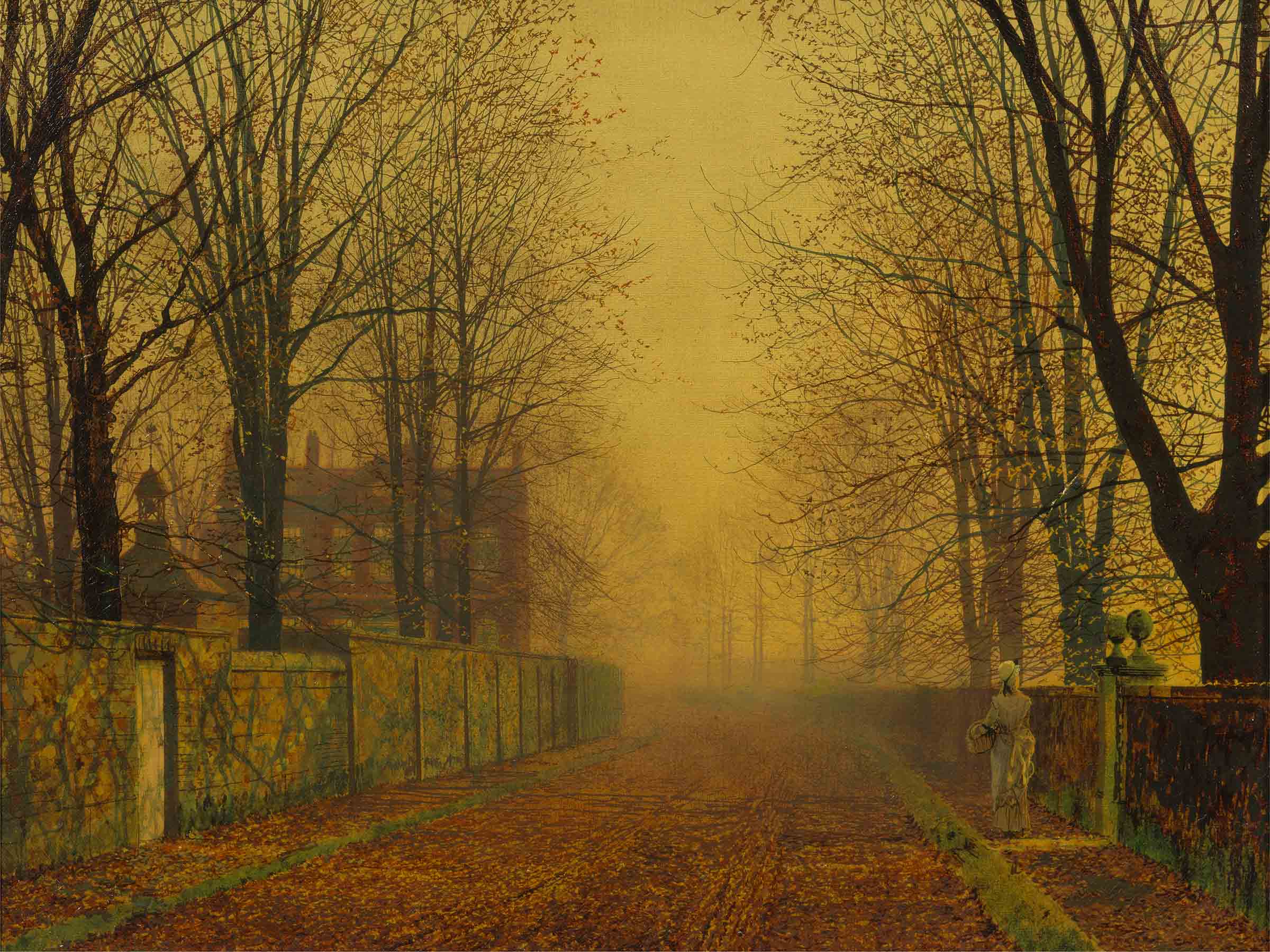 18th century, atmosphere, autumn, branch, detailed, evening, fall, glow, lady, leaves, natural environment, natural landscape, people in nature, plant, road, sky, tree, twig, wood